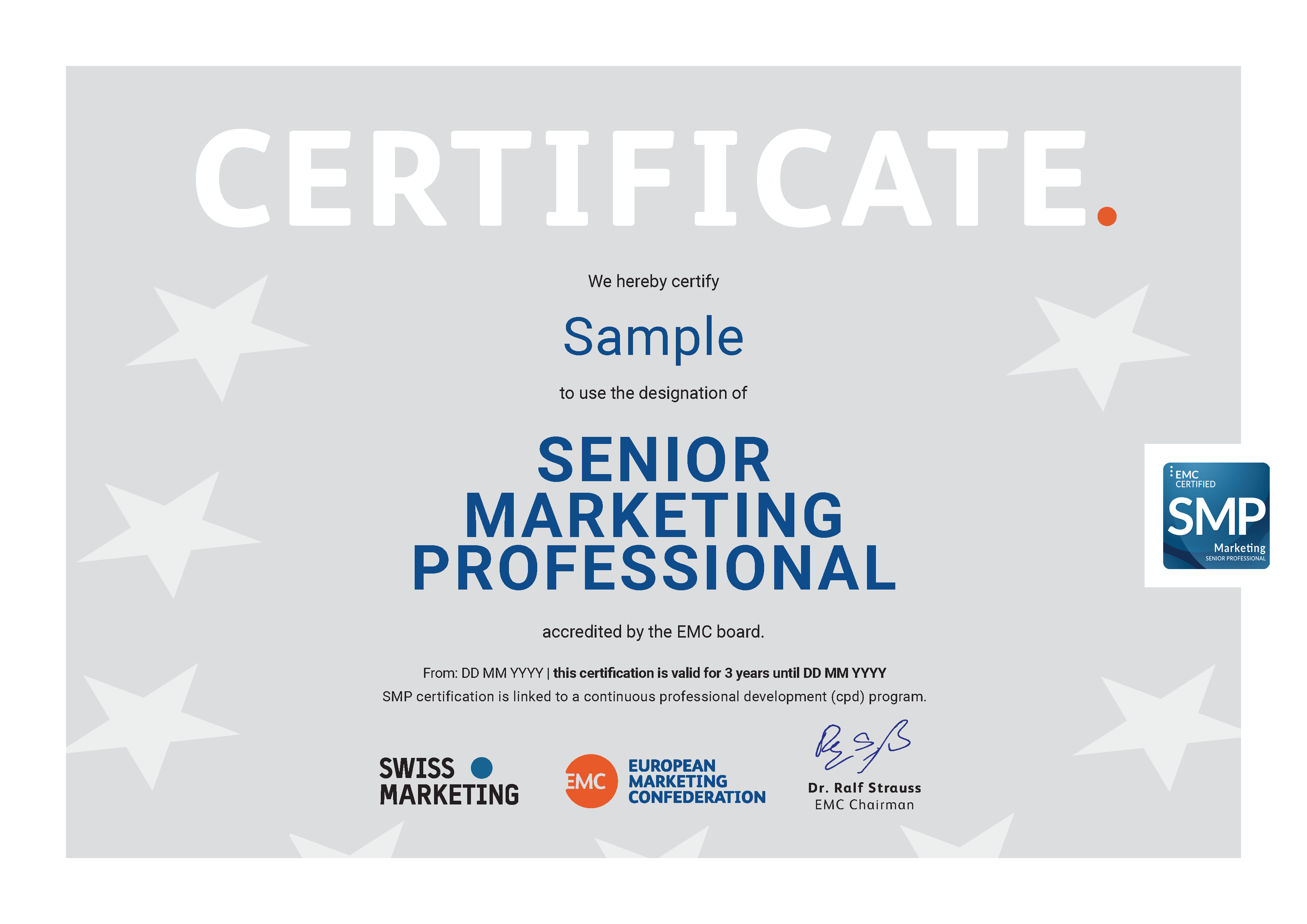 Le certificat Senior Marketing Professional est un certificat internationalement reconnu de niveau EMC 6 (niveau bachelor). Il est délivré sur la base de votre expérience et est valable tant que vous entretenez et approfondissez continuellement vos connaissances techniques. Il est comparable aux programmes de développement continu (CDP) d’autres domaines professionnels tels que la médecine ou le droit.
